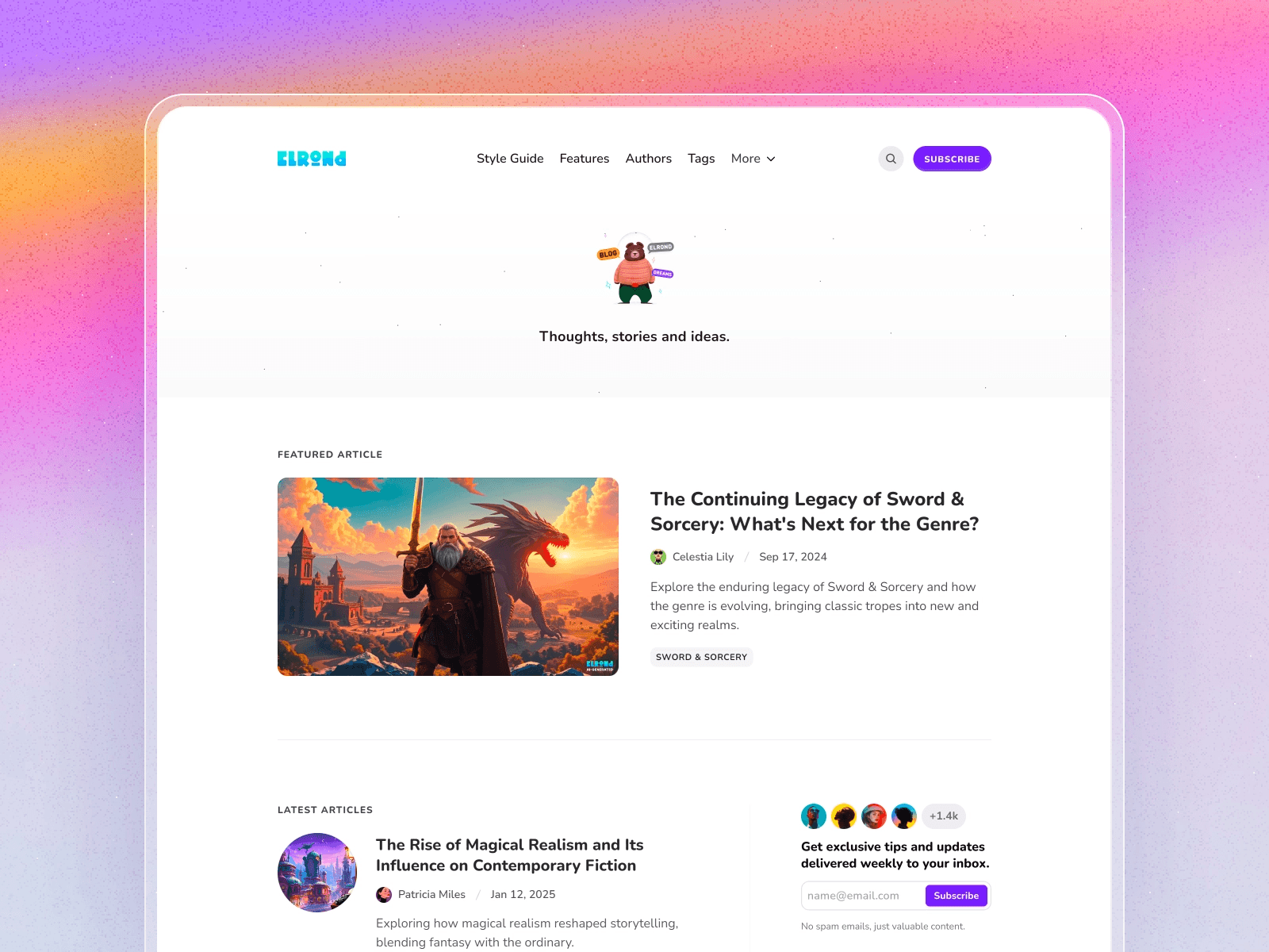 Elrond is a template designed for bloggers who want creative flexibility without losing content structure. The layout offers dynamic section arrangements that adapt to different content types, supporting photo essays, opinion pieces, and tutorials within a cohesive visual framework.