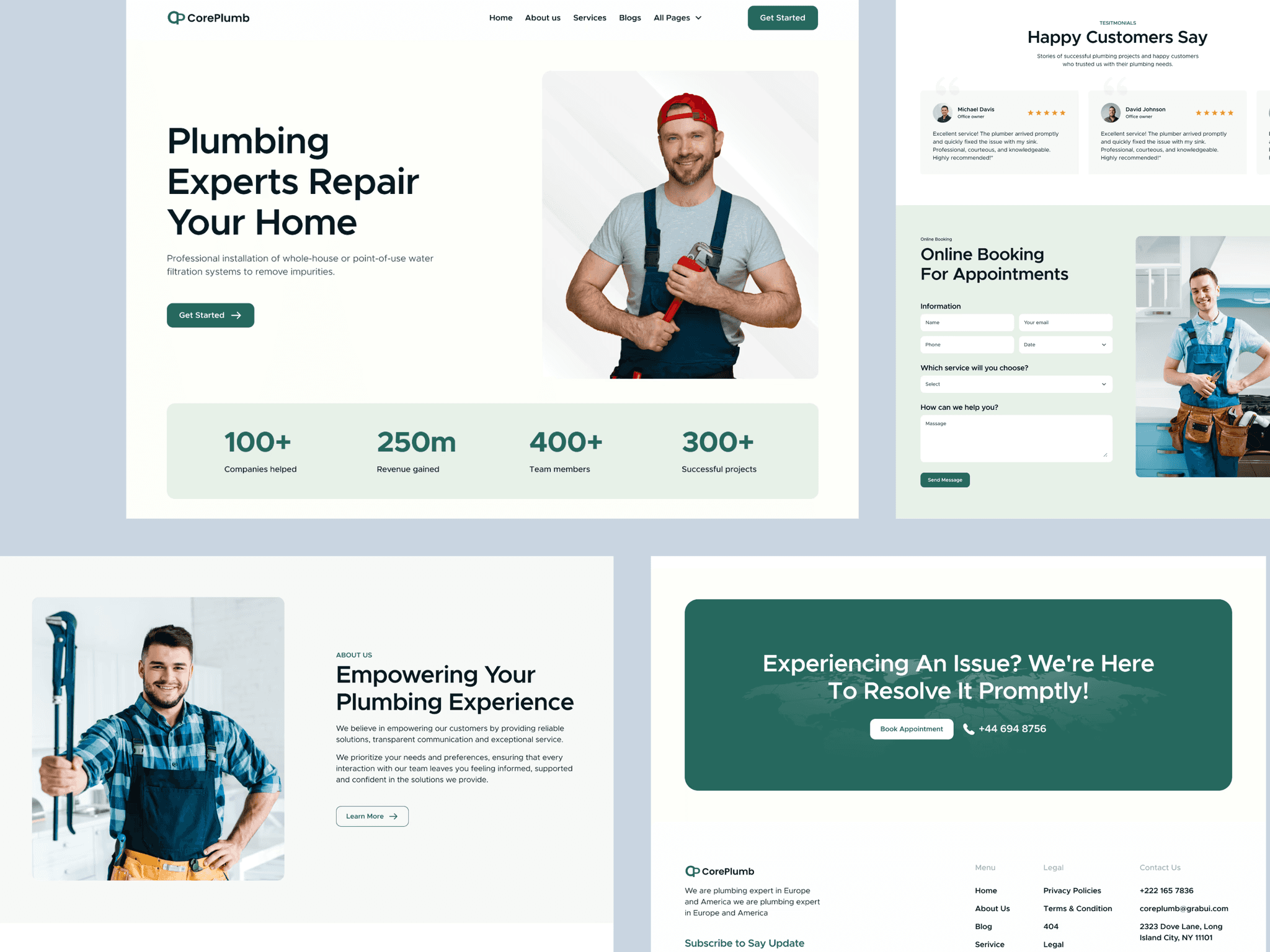 It structures service descriptions, coverage areas, and customer testimonials into a logical evaluation flow that mirrors how homeowners assess local service providers under time pressure. Trust indicators like experience years, satisfaction guarantees, and licensing are positioned to reduce hiring hesitation immediately. Typography is clean and direct, avoiding unnecessary complexity