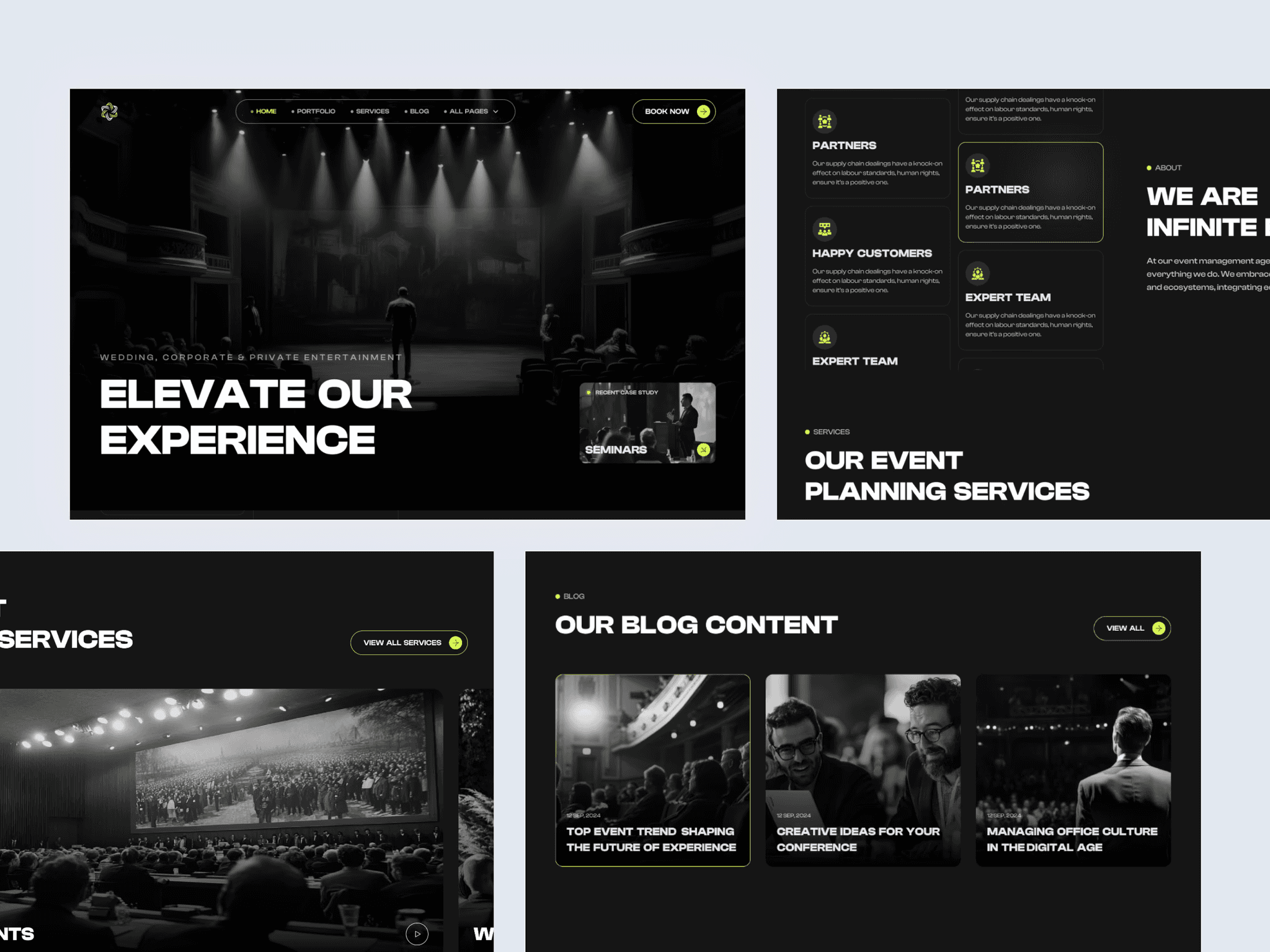 Spacing and typography maintain professionalism despite the energetic tone, preventing the design from feeling chaotic. Eventivee is ideal for boutique event studios, launch party specialists, and creative production teams targeting startups and lifestyle brands.