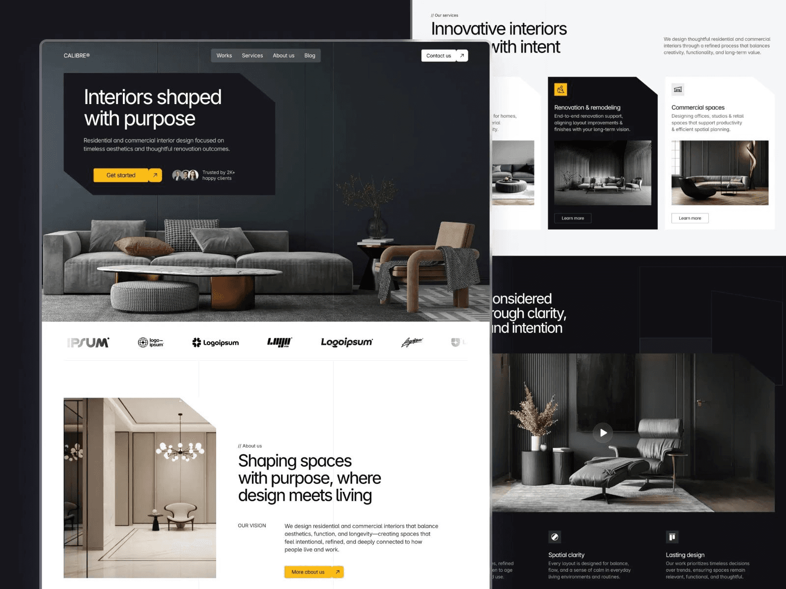 Calibre is a template designed for architecture and design firms that balance creative vision with business credibility. The layout integrates project showcases with structured service descriptions, team introductions, and client testimonials, supporting full agency positioning rather than portfolio-only presentation.