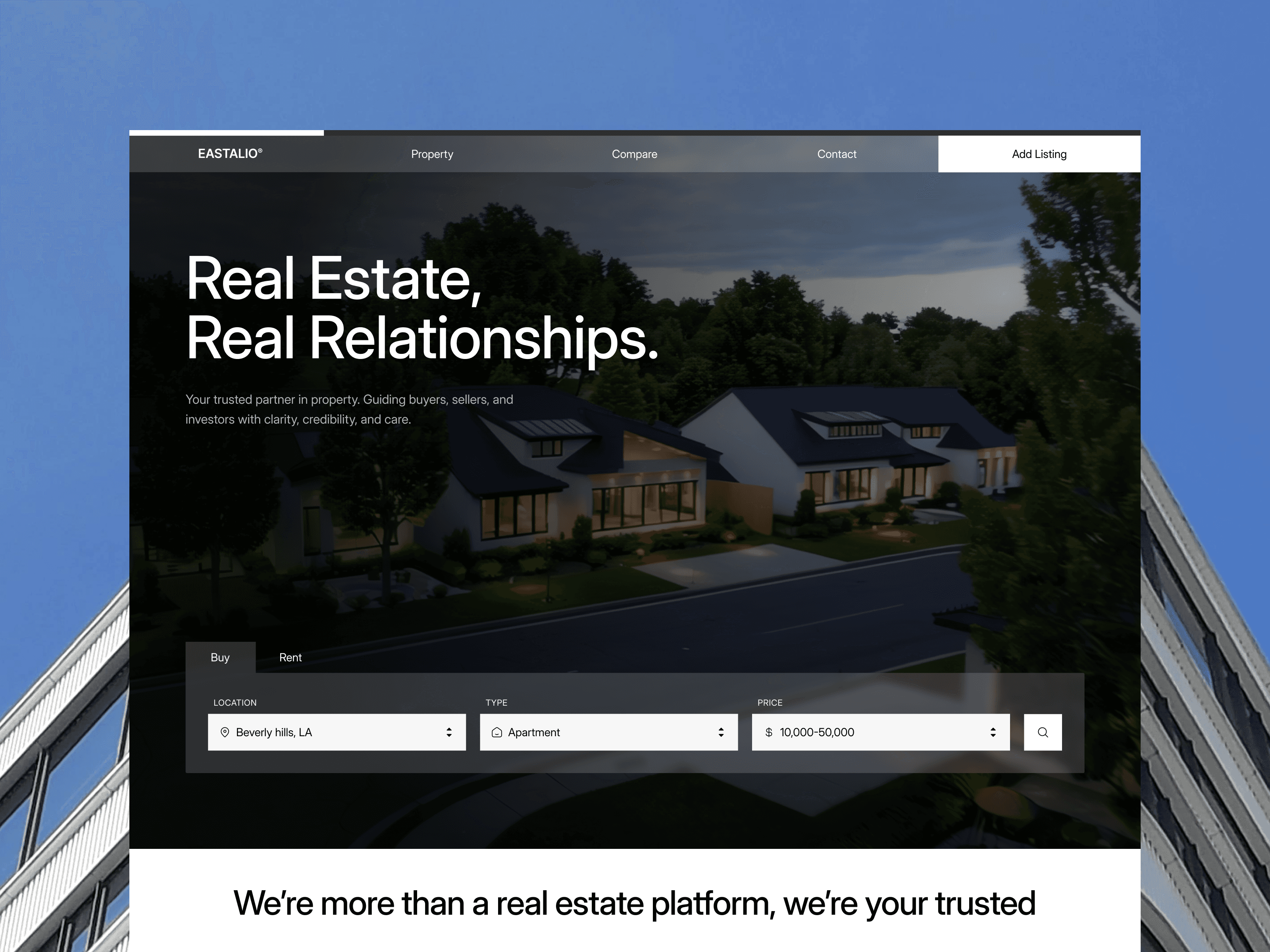 Eastalio structures information to reduce buyer hesitation like listings, services, and agency credibility are presented in a logical evaluation flow. Property presentation emphasizes clarity over exaggeration and images are framed cleanly, helping buyers assess spaces realistically.